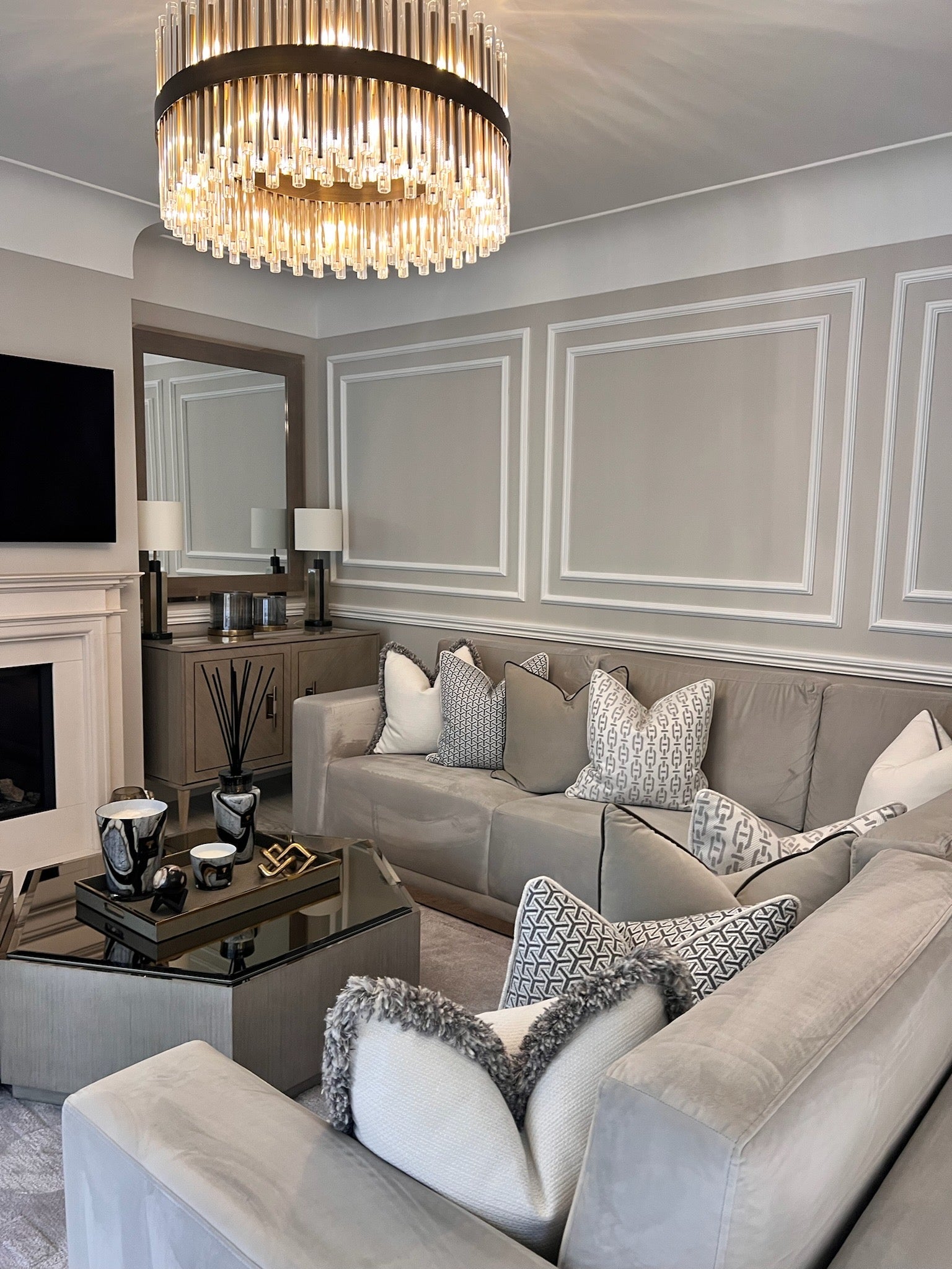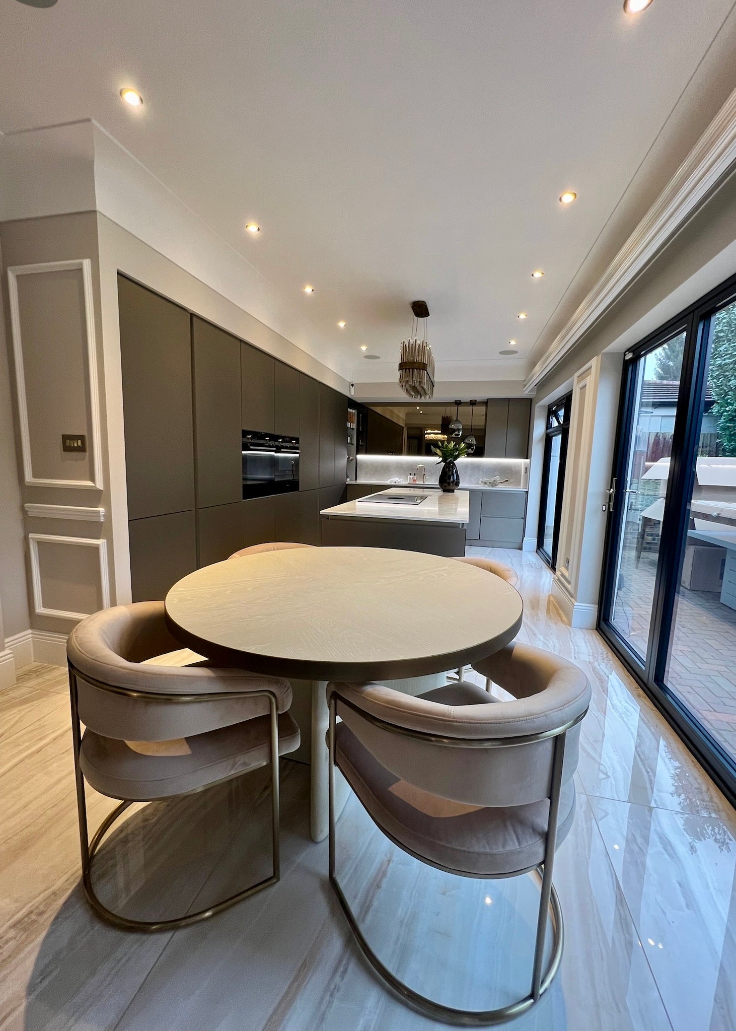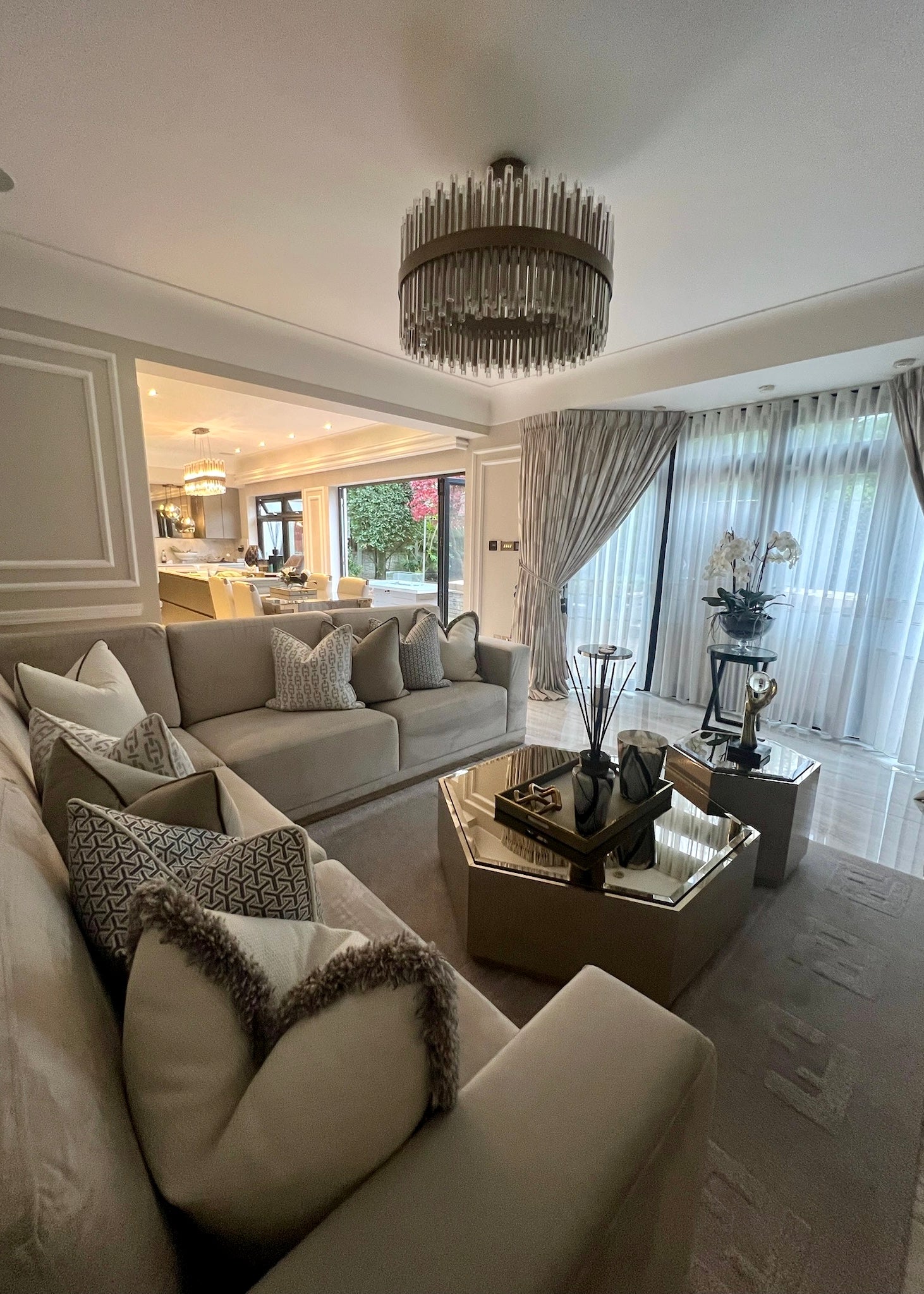 Our team created a sleek, contemporary look throughout the property, featuring bespoke furniture, custom wallpapers, and a sophisticated colour scheme. The living spaces include luxurious bespoke sofas, elegant dining tables and chairs, and exclusive accessories that bring the whole design together.